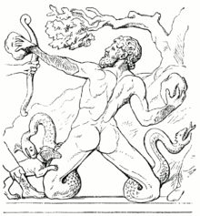 Later in the Metamorphoses, Ovid refers to the Gigantomachy as "the time when serpent footed giants strove / to fix their hundred arms on captive Heaven".[68] Here Ovid apparently conflates the Giants with the Hundred-Handers,[69] who, though in Hesiod fought alongside Zeus and the Olympians, in some traditions fought against them.[70]
