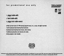 - ↑ The Downward Spiral (Interscope Records/nothing/TVT, March 8, 1994) booklet; "Piggy" lyrics.