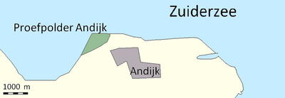 In 1924 the Lovink Committee published a proposal to build a pilot polder.[2] This polder could, on a small scale experiment future agriculture. The knowledge would then be used for the Wieringermeer. For this reason, in 1926-1927 near the village Andijk, 40 hectares of land were reclaimed.[1] On August 27, 1927, the pilot polder was drained. The cost of the polder, about 1 million guilders,[3] was relatively high, but the cost of polders to come should be lower.