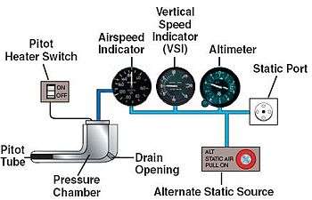 A pitot-static system is a system of pressure-sensitive instruments that is most often used in aviation to determine an aircraft's airspeed, Mach number, altitude, and altitude trend. A pitot-static system generally consists of a pitot tube, a static port, and the pitot-static instruments.[1] Other instruments that might be connected are air data computers, flight data recorders, altitude encoders, cabin pressurization controllers, and various airspeed switches. Errors in pitot-static system readings can be extremely dangerous as the information obtained from the pitot static system, such as altitude, is potentially safety-critical. Several commercial airline disasters have been traced to a failure of the pitot-static system.[2]