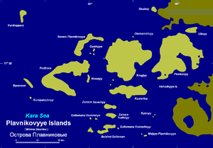 The Plavnikovye Islands (Russian: острова Плавниковые; Ostrova Plavnikovyye) is a group of islands, in the Kara Sea eastern region, off the coast of Siberia. These islands are covered with tundra vegetation and there are many lakes and swamps. They are under snow and ice during most of the year.