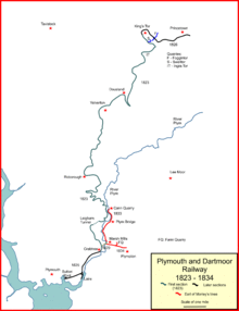 - ↑ Authorities are imprecise about the extent of the first opening. The most thorough works are probably Kendall, and also Shepherd, who on page 51 simply refers to "Opening Day" without indicating the extent. On the same page he says that "the extensions at each end of the line—to Sutton Pool in the south and to Princetown in the north—were completed in December 1825 and December 1826 respectively". However his map of the line on page 9 shows "original terminus of the line" at Crabtree. Dart, in "Devon Narrow Gauge" says on the page following plate 21, that "In 1825 the line was extended to Sutton Harbour, with a branch to Laira (Martin's) Wharf. The section from the quarries to Princetown opened in 1826." (Laira is on the Cattewater, a location also referred to.)