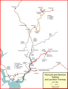 The transfer took place in 1878: the Princetown Railway paid £22,000 in shares for the necessary part of the line, and it opened on 11 August 1883.[8][24] The activities of the Plymouth and Dartmoor Railway were now confined to the Lee Moor traffic from the point where that line joined; in Plymouth there were interchange arrangements with the Great Western Railway (GWR) at Laira, and a wharf on the Plym, also at Laira.