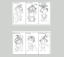 The characters in the comic, are Pygmies, which are unusually small. They have their hair tied up with a bone, wearing a grass skirt, or kilt, tanned skin, large eyes, and a large head. Comically, it seems to look that none of them have noses. The following six characters make up the tribe Oogka Chaka.