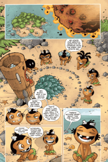 Pocket God is a series of digital and paperback[1] comic books–strips, published by Ape Entertainment,[2] published and marketed by iVerse Media,[3] released for iOS devices, and available as a print in retailers, via contest,[4] on August 3, 2010.[5] The comic is created and plotted by Dave Castelnuovo and Allan Dye, written by Jason M. Burns and drawn by Rolando Mallada. It describes in the comic about "an indestructible race of people who inhabit a mysterious island and are continuously (and comically) tortured by their mischievous gods". The comic is based on the best selling iOS application Pocket God, created by Bolt Creative's Allan Dye and Dave Castelnuovo. The tribe, 'Ookga Chaka', is based also off the game, with the Pygmies, Ooga, Klik, Klak, Booga, Dooby, and Nooby.