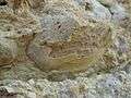 Many of these layers are especially visible and easily accessible at La Pointe du Chay, in which are encapsulated many small marine fossils. Layers of thick white rocks, formed during period of relatively warm seas, alternate with highly friable layers containing sands and remains of mud, formed during colder periods, and with layers containing various corals, that were formed during warmer, tropical times.[1]