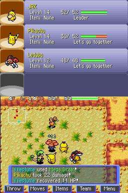 These jobs take part in dungeons, of which the layout is randomized.[1] The objective is to either finish a job, or go through all the floors to find the exit.[1] In the dungeon, there are wild Pokémon that battle with the player's team.[1] These battles are turn-based, and take place in the dungeon map.[1] Pokémon fight using the four moves they know, by using a standard 'A button' attack,[1] or throwing rocks and other items.[2] While going through the dungeon, the player gets hungry, and has to eat food either found in the dungeon, or bought in advance.[1]