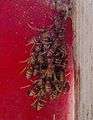 Wasps of the cosmopolitan genus Polistes (the only genus in the tribe Polistini) are the most familiar of the polistine wasps, and are the most common type of paper wasp in North America. It is also the single largest genus within the family Vespidae, with over 300 recognized species and subspecies. Their innate preferences for nest-building sites leads them to commonly build nests on human habitation, where they can be very unwelcome; although generally not aggressive, they can be provoked into defending their nests. All species are predatory, and they may consume large numbers of caterpillars, in which respect they are generally considered beneficial. The European paper wasp, Polistes dominula, was introduced into the US about 1981 and has quickly spread throughout most of the country, in most cases replacing native species within a few years. This species is very commonly mistaken for a yellow jacket, as it is black, strongly marked with yellow, and quite different from the native North American species of Polistes. The cuckoo wasp, Polistes sulcifer, is an obligate social parasite, whose only host is P. dominula.[2] Polistes annularis, whose species name is Latin for "ringed", is also known for its distinctive red body color.[3] Polistes metricus adults malaxate their insect prey by chewing them into a pulp, sucking out and ingesting the body fluids, then feeding the rest of the morsel to their larvae.[4] The most widely distributed South American wasp species, Polistes versicolor, is particularly common in the southeastern Brazilian states. This social wasp is commonly referred to as the yellow paper wasp due to the distinct yellow bands found on its thorax and abdomen.[5] Polistes wasps can be identified by their characteristic flight; their long legs dangle below their bodies, which are also more slender than a yellow jacket.[6]