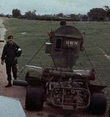 The Pookie was a small one-person vehicle named after the bush baby, and fitted with large Formula One tires bought second hand after the South African Grand Prix. The wide tyres prevented the detonation of buried mines by exerting less ground pressure than a human footprint and spanning the mines' circumference.[1] The vehicle was made with readily-available parts from the Volkswagen Kombi and resembles a small go-cart with an elevated cab to protect the driver.[1] The bottom of the cab had a V-shaped reinforced hull to deflect the blast away from the operator. Sensor 'pans', resembling rectangular wings, were lowered and used perpendicular to the ground below the cab. When the vehicle was transported, the pans were raised at a 45 degree angle.