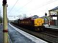 A ten-coach enthusiasts' special passing through Port Glasgow station. The rear loco carried a plate bearing "Pathfinder Tours". Such trains are not a common sight on this line. St Andrews church can be seen in the background.