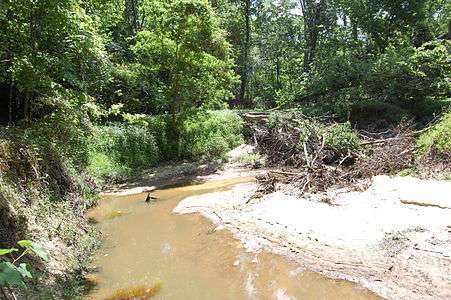 Port Hudson State Historic Site is located north of the community of Port Hudson, on the west side of United States Route 61. The property of the site extends west to Thompson Creek, and is bounded on the north by Sandy Creek and partly on the south by Foster Creek. This area forms a terrace about 65 to 80 feet (20 to 24 m) above the creeks, with twisting and steep terrain that made for a natural defensive position, and is where Union Army forces were dug in. The area immediately to the southwest of Foster Creek has similar terrain, and is where Confederate defensive positions were located.[4] These positions were but a small portion of the total offensive and defensive positions, which entirely ringed the community, and included artillery emplacements overlooking the nearby Mississippi River.