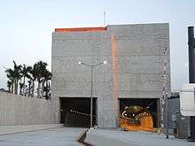 The PortMiami Tunnel (also State Road 887; formerly Port of Miami Tunnel) is a 4,200 feet (1,300 m)[3] bored, undersea tunnel in Miami, Florida. It consists of two parallel tunnels (one in each direction) that travel beneath Biscayne Bay, connecting the MacArthur Causeway on Watson Island with PortMiami on Dodge Island. It was built in a public–private partnership between three government entities—the Florida Department of Transportation, Miami-Dade County, and the City of Miami—and the private entity MAT Concessionaire LLC, which was in charge of designing, building, and financing the project and holds a 31-year concession to operate the tunnel.[4][5][6]