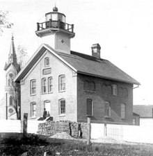 Requests for a lighthouse for the harbor were first presented to congress in 1845, and in 1848 $3,500 was appropriated for construction.[4] This light was completed in 1849 and consisted of a tower and separate keeper's house, both constructed of Cream City brick.[5] The tower was somewhat over 35 feet (11 m) tall and was equipped with an array of five Lewis lamps with 14-inch (360 mm) reflectors. It was lit for the first time on May 8, 1849.[4][5] In 1856 a sixth-order Fresnel lens was installed. This lamp was 36 feet (11 m) from the ground and 109 feet (33 m) above the water.[5]
