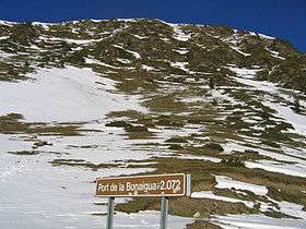 Port de la Bonaigua (el. 2072 m., 6,798 ft) is a mountain pass in the Pyrenees in Catalonia, Spain. It connects Esterri d'Àneu in the comarca of Pallars Sobirà with Vielha e Mijaran in the comarca of Aran. The Baqueira-Beret ski resort is located at the top of the pass.