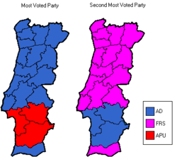 | A Alliance formed by the Social Democratic Party (74 seats), the Democratic and Social Centre (46 seats) and the People's Monarchist Party (6 seats). B Social Democratic Party and Democratic and Social Centre electoral list only in Azores and Madeira. C Alliance formed by the Socialist Party (63 seats), the Leftwing Union for the Socialist Democracy (4 seats) and the Independent Social-Democratic Action (4 seats). D Socialist Party electoral list only in Azores and Madeira. E Portuguese Communist Party (39 MPs) and Portuguese Democratic Movement (2 MPs) ran in coalition.[3] | ||||||||||