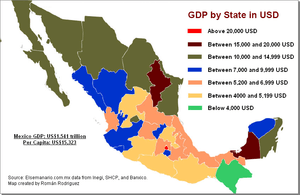 Historically, southern states like Chiapas, Oaxaca, and Guerrero have remained segregated from the rest of the country.[34] Their implementation of infrastructure, social development, education, and economic growth has been poorly accounted for. These states hold the highest levels of illiterates, unemployment, lack of basic services such as running water and sanitation, overall urban infrastructure, and government establishment.[35] As citizens of the least fortunate states have noticed growth and improvements in others states, many have simply left seeking better opportunities.[36]