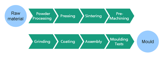 - Pressing: This step does the pre-forming of "green" raw bodies of the mould inserts.