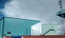 The Cowshed houses away fans at Prenton Park, and has a capacity of 2,500.[4] It has a slanted seating arrangement, caused by the main road running behind it.[12] It historically housed the more vocal home fans, but was switched to away supporters around the start of the 21st century.[12] Since the change, a bar and TV screens have been added to the stand.[12]