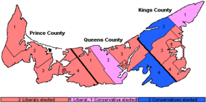 | Map of PEI's ridings coloured in based on how they voted | |||||||||||||||||||||||||||||||||||||||||||||||