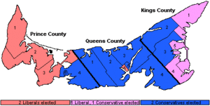 | Map of PEI's ridings coloured in based on how they voted | |||||||||||||||||||||||||||||||||||||||||||||||
