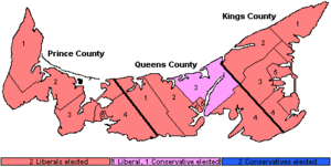 | Map of PEI's ridings coloured in based on how they voted | |||||||||||||||||||||||||||||||||||||||||||||||