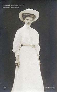 Princess Adelaide Louise of Schleswig-Holstein-Sonderburg-Glücksburg (German: Adelheid Luise; 19 October 1889 – 11 June 1964) was a daughter of Friedrich Ferdinand, Duke of Schleswig-Holstein and his wife Princess Karoline Mathilde of Schleswig-Holstein-Sonderburg-Augustenburg.[1][2]