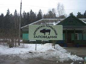 Prioksko-Terrasny Nature Biosphere Reserve (Russian: Приокско-Террасный государственный природный биосферный заповедник) is one of Russia's smallest zapovedniks (nature reserves), sprawling over an area of 5,000 hectares along the left bank of the Oka River in the Serpukhov District of Moskva Oblast. It was established in 1945 as part of the Moscow Nature Reserve and is home to 900 plant species, 130 bird species, and 54 mammal species. A wisent nursery was established in 1948 to populate the region with European bisons from the Belovezhskaya Pushcha and Western Caucasus. There is also a small herd of American bisons.