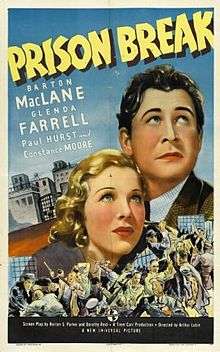 Prison Break is a 1938 American crime-drama film directed by Arthur Lubin, starring Barton MacLane and Glenda Farrell.[1][2] The film was based on the story "Walls of San Quentin" by Norton S. Parker. It was released by Universal Pictures on July 12, 1938. A fisherman confesses to a murder he didn't commit to protect a friend. Determined to keep out of trouble in prison, but another convict makes things difficult for him.