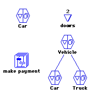 Prograph took these concept further, introducing a combination of object-oriented methodologies and a completely visual environment for programming. Objects are represented by hexagons with two sides, one containing the data fields, the other the methods that operate on them. Double-clicking on either side would open a window showing the details for that object; for instance, opening the variables side would show class variables at the top and instance variables below. Double-clicking the method side shows the methods implemented in this class, as well as those inherited from the superclass. When a method itself is double-clicked, it opens into another window displaying the logic.