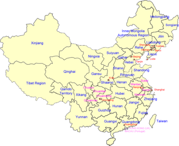Xinjiang Uyghur Autonomous Region Tibet (Xizang) Autonomous Region Qinghai Province Gansu Province Sichuan Province Yunnan Province Ningxia Hui Autonomous Region Inner Mongolia (Nei Mongol) Autonomous Region Shaanxi Province Municipality of Chongqing Guizhou Province Guangxi Zhuang Autonomous Region Shanxi Province Henan Province Hubei Province Hunan Province Guangdong Province Hainan Province Hebei Province Heilongjiang Province Jilin Province Liaoning Province Municipality of Beijing Municipality of Tianjin Shangdong Province Jiangsu Province Anhui Province Municipality of Shanghai Zhejiang Province Jiangxi Province Fujian Province Hong Kong Special Administrative Region Macau Special Administrative Region Taiwan ProvinceChina administrative claimed included.svg