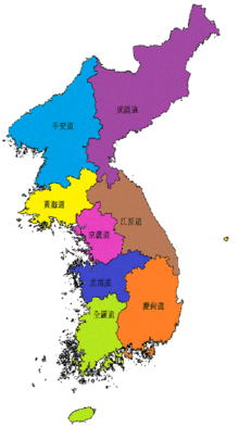 In 1413, Korea (at that time called Joseon) was divided into eight provinces: Chungcheong, Gangwon, Gyeonggi, Gyeongsang, Jeolla, Hamgyŏng (originally called Yeonggil), Hwanghae (originally called P'unghae), and P'yŏngan.