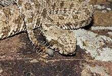 The spider-tailed horned viper (Pseudocerastes urarachnoides) is a species of viper endemic to western Iran which was described in 2006. The head looks very similar to that of other Pseudocerastes species in the region but it has a unique tail that has a bulb-like end and bordered by long drooping scales that give it the appearance of a spider. The tail tip is waved around and used to lure insectivorous birds within striking range.[2]