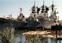 On December 1, 1945, the navy yard's name was changed to Puget Sound Naval Shipyard. After the war, the Naval Inactive Ship Maintenance Facility became a tenant at the shipyard. Until recently, USS Missouri (BB-63) was moored here, open to visitors.[2] Inactive ships today include aircraft carriers, cruisers, destroyers, and submarines. Puget Sound Naval Shipyard has remained active since World War II. During the Korean War, it was engaged in a ship activation program. In 1957, construction of guided missile ships began. Since 1961, Puget Sound has been engaged in the repair of both conventional and nuclear-powered aircraft carriers, surface ships, and submarines.[2]