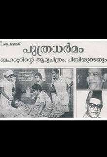 Puthradharmam is a 1954 Indian Malayalam film, directed by Vimal Kumar and produced by KV Koshy.[1] The film stars Prem Nazir, Kumari Thankam in lead roles.[2] The film had musical score by PS Divakar.[3]