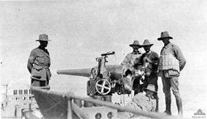 On 20 September 1914 the British cruiser HMS Pegasus was sunk by SMS Königsberg in Zanzibar harbour. Her 8 QF 4-inch Mk III guns were recovered and used ashore in the East African campaign. Some were used as coast defence guns at Zanzibar and Mombasa. Two guns, and from 11 February 1916, three guns, were used by 10th Heavy Battery manned by the Royal Marines, mounted on improvised field carriages and towed by Packard lorries, supported by six REO lorries carrying ammunition.[5]