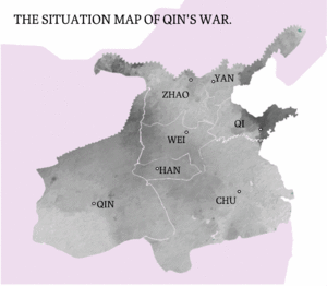Over the course of the Warring States period, the Qin state had evolved to become the most powerful of the seven major states in China. In 238 BC, Ying Zheng came to the throne of Qin after eliminating his political rivals Lü Buwei and Lao Ai. With help from Li Si, Wei Liao (尉繚) and others, Ying Zheng formulated a plan for conquering the other six major states and unifying China.[1] The plan, which focuses on annexing each state individually, is based on "allying with distant states and attacking nearby ones", one of the Thirty-Six Stratagems. Its key steps were: ally with Yan and Qi; hold down Wei and Chu; conquer Han and Zhao.