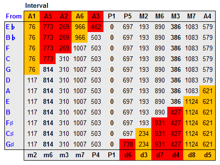 On the contrary, the intervals from D shown in the table above, since D is at the center of the stack, do not include wolf intervals and include a pure m6 (from D to B♭), instead of an impure A5. Notice that in the above mentioned set of 144 intervals pure m6's are more frequently observed than impure A5's (see table below), and this is one of the reasons why it is not desirable to show an impure A5 in the construction table. A C-based symmetric stack might be also used, to avoid the above mentioned drawback:
