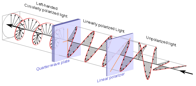 A waveplate or retarder is an optical device that alters the polarization state of a light wave travelling through it. Two common types of waveplates are the half-wave plate, which shifts the polarization direction of linearly polarized light, and the quarter-wave plate, which converts linearly polarized light into circularly polarized light and vice versa.[1] A quarter wave plate can be used to produce elliptical polarization as well.