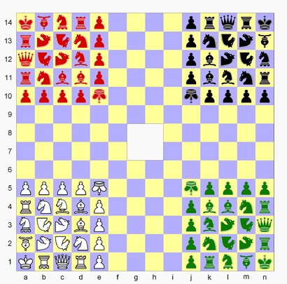 Quatrochess is a chess variant for four players invented by George R. Dekle, Sr. in 1986.[1][2] The board comprises 14×14 squares minus the four central squares. Each player controls a standard set of sixteen chess pieces, and additionally nine fairy pieces. The game can be played in partnership (two opposing teams of two) or all-versus-all.