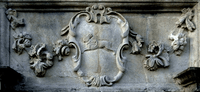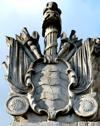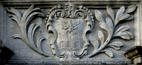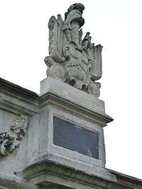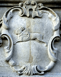 | Granville: Gules, three clarions or. For George Granville, 1st Baron Lansdowne of Bideford (1666-1735), nephew of John Granville, 1st Earl of Bath (1628–1701) and heir male of William Henry Granville, 3rd Earl of Bath (1692-1711).[38] It is the only escutcheon with heraldic supporters, generally reserved for use by nobility, here Two winged griffins rampant or. Above the escutcheon is a baron's coronet. He is identifiable by the style of his coronet and by his motto, shown inscribed on a scroll below: Deo, Patriae, Amicis[39] ("For God, my Country and Friends"), the motto of his uncle John Granville, 1st Earl of Bath having been: Futurum invisibile ("The future is unseen").[40] The arms are not those of John Granville, 1st Earl of Bath (1628–1701), or of his son Charles Granville, 2nd Earl of Bath (1661–1701). The latter's son William Granville, 3rd Earl of Bath (1692-1711) died aged only 19 two years before the building was completed in 1713. | ||||