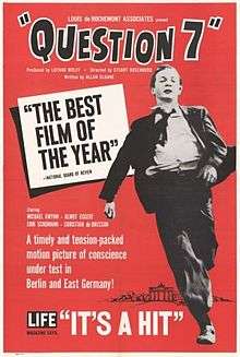 Question 7 is a 1961 film directed by Stuart Rosenberg and starring Michael Gwynn, Margaret Jahnen and Christian de Bresson. It won the National Board of Review Award for Best Film. It was also entered into the 11th Berlin International Film Festival.[1]