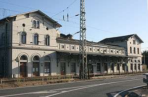 Rüdesheim (Rhein) station is in the town of Rüdesheim am Rhein in the German state of Hesse on the East Rhine Railway (German: Rechte Rheinstrecke). It is on the western edge of the town separated from the Rhine only by federal highway B 42. The entrance building is a double storey stucco building in a neoclassical style. It is now one of the cultural monuments listed in UNESCO World Heritage Site of the Upper Middle Rhine Valley. The station is classified by Deutsche Bahn as a category 5 station.[1]