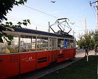 From 1947, Răşinari was linked to Sibiu by an electric tram line which crossed Dumbrava Forest, but service became sporadic in the late 2000s and ceased entirely on 28 February 2011.[1] Very limited operation that took place later – mainly only for visiting tourist groups – ended in 2012,[2] followed in 2013 by the start of work to dismantle the line. It is hoped to reopen a portion as a heritage tramway.[2] The trams in use since the mid-1990s were formerly used in Geneva and retained their French-language signs.[3] In 2013, they were sold to Răşinari for a low price and moved to the Răşinari end of the tram line, just before work to remove the tracks and overhead trolley wires began.[2] Officials in Răşinari are attempting to obtain funding to build a small depot (carhouse) and to reopen a portion of the line as a tourist attraction.[2]