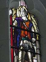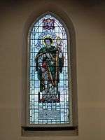 The present church of St Michael and All Angels of Jarvis Brook, Sussex was built in 1905 on a site given by Lord Abergavenny and designed by John Beaumont Tansley.[8] Nugent Francis Cachemaille-Day remodelled the interior in 1935. There is a Christopher Webb 1936 East window and in 1950 Rachel de Montmorency was responsible for the first window in the South Nave. This window was installed in memory of Captain Charles Bunburby R.N, who was a sidesman and a member of the Parochial Church Council for many years. The window depicts St. Nicholas, patron of sailors, who holds a ship. Below there is a lighthouse. The inscription reads "He bringeth them unto the haven where they would be".[5]