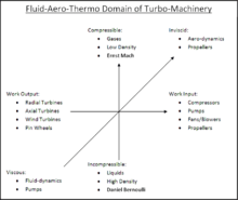 Figure 1.1 represents the aero-thermo domain of turbomachinery. The horizontal axis represents the energy equation derivable from The First Law of Thermodynamics.[1][11] The vertical axis, which can be characterized by Mach Number, represents the range of fluid compressibility (or elasticity).[1][11] The Z-axis, which can be characterized by Reynolds Number, represents the range of fluid viscosities (or stickiness).[1][11] Mathematicians and Physicists who established the foundations of this aero-thermo domain include:[12][13] Sir Isaac Newton, Daniel Bernoulli, Leonhard Euler, Claude-Louis Navier, Sir George Gabriel Stokes, Ernst Mach, Nikolay Yegorovich Zhukovsky, Martin Wilhelm Kutta, Ludwig Prandtl, Theodore von Kármán, Paul Richard Heinrich Blasius, and Henri Coandă.