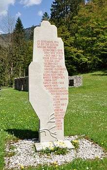 On 29 September 1944 the entire hamlet of Srednja Radovna was burned to the ground by the German Army after a minor engagement with the Partisans in revenge for two of their numbers being taken and the locals' unwillingness to inform on the Partisans. Twenty-four villagers were killed and a memorial to the victims of this event has been erected in the valley.[2]