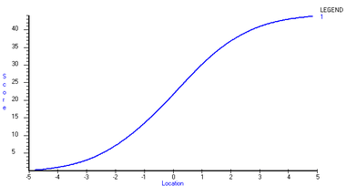 When all test-takers have an opportunity to attempt all items on a single test, each total score on the test maps to a unique estimate of ability and the greater the total, the greater the ability estimate. Total scores do not have a linear relationship with ability estimates. Rather, the relationship is non-linear as shown in Figure 1. The total score is shown on the vertical axis, while the corresponding person location estimate is shown on the horizontal axis. For the particular test on which the test characteristic curve (TCC) shown in Figure 1 is based, the relationship is approximately linear throughout the range of total scores from about 10 to 33. The shape of the TCC is generally somewhat sigmoid as in this example. However, the precise relationship between total scores and person location estimates depends on the distribution of items on the test. The TCC is steeper in ranges on the continuum in which there are a number of items, such as in the range on either side of 0 in Figures 1 and 2.