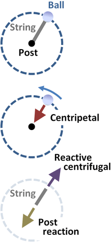 The figure at right shows a ball in uniform circular motion held to its path by a massless string tied to an immovable post. The figure is an example of a centrifugally-directed real force. In this system a centripetal force upon the ball provided by the string maintains the circular motion, and the reaction to it, usually called the reactive centrifugal force acts upon the string. In this model, the string is assumed massless and the rotational motion frictionless, so no propelling force is needed to keep the ball in circular motion.