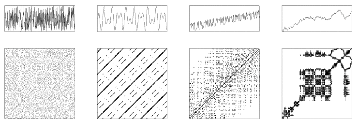 Typical examples of recurrence plots (top row: time series (plotted over time); bottom row: corresponding recurrence plots). From left to right: uncorrelated stochastic data (white noise), harmonic oscillation with two frequencies, chaotic data with linear trend (logistic map) and data from an auto-regressive process.