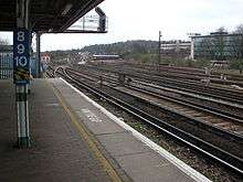 The station is 22 miles 40 chains (36.2 km) from Charing Cross, and has three passenger platforms and a parcels bay (which is now out of use). Platforms 1 and 2 are an island on the northbound (Up) side and Platform 3 and the old parcels dock are on the southbound (Down) side. There are two through lines between platforms 2 and 3. All passenger platforms are of 12 car length, and all are subdivided into 'a' (north end) and 'b' (south end). All platforms have access to all routes, although there is no access from either through line to or from the North Downs Line - all traffic from this direction must pass through a platform.[9]